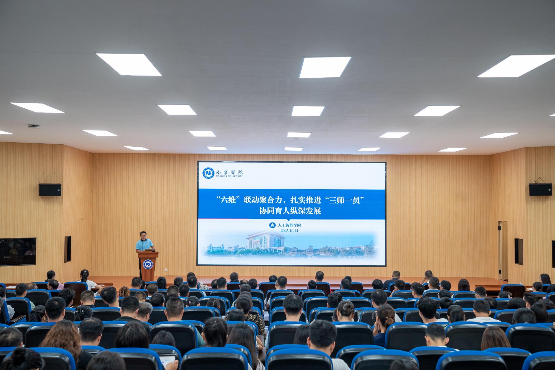 在新时代立德树人根本任务的引领下,南宁学院持续深化“三全育人”综合改革,以“三师一员”协同育人机制为抓手,积极探索多元育人路径。10月14日,南宁学院“三师一员”大讲堂第三讲在敷文园E104报告厅隆重举行,标志着学校育人体系建设进入新阶段。本次活动由副校长龚击主持,特邀人工智能学院与东盟学院作专题分享,校领导班子、各职能部门与二级学院负责人及教师代表共同参与。